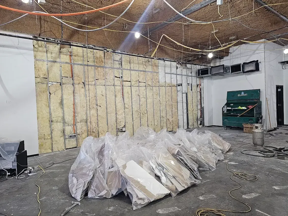 The work area is fully isolated with dust barriers and protective sheeting to prevent contamination of unaffected areas. Floors are covered, and ventilation systems are sealed where necessary.